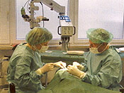 | Dr. Gorzny: Kinder werden immer in Vollnarkose, Erwachsene auch schon einmal in Lokalanästhesie an zwei Augenmuskeln operiert (Rücklagerung des Muskels = Verlängerung, Faltung oder Resektion des Muskels = Verkürzung). Auf diese Weise kann das Auge in die gewünschte Richtung gedreht werden. |